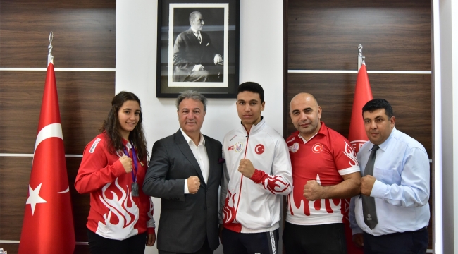 Elde ettikleri derecelerle Türkiye'nin gururu olan sporcular Sevim Ada ile Taylan Leyne, antrenörleri ve Türkiye Muaythai Federasyonu Ege Bölgesi Asbaşkanı Şakir Bayramoğlu ile birlikte Bornova Belediye Başkanı Dr. Mustafa İduğ'u, 29 Ekim Cumhuriyet Kupası'ndan hemen önce ziyaret etti. Başkan İduğ ziyarette, elde ettikleri başarıların mutluluğunu paylaşan sporcuları tebrik ederek, daha çok gencin aynı yoldan ilerleyebilmesi için imkanlar ölçüsünde her türlü desteği vereceklerini söyledi. Başkan İduğ, başarılı gençlerin antrenörlüklerini de yapan Muaythai İzmir İl Temsilcisi Murat Yılmaz ve İl Temsilci Yardımcısı Nuri Karaca'dan ihtiyaç duydukları desteklerle ilgili bir rapor hazırlamalarını istedi
