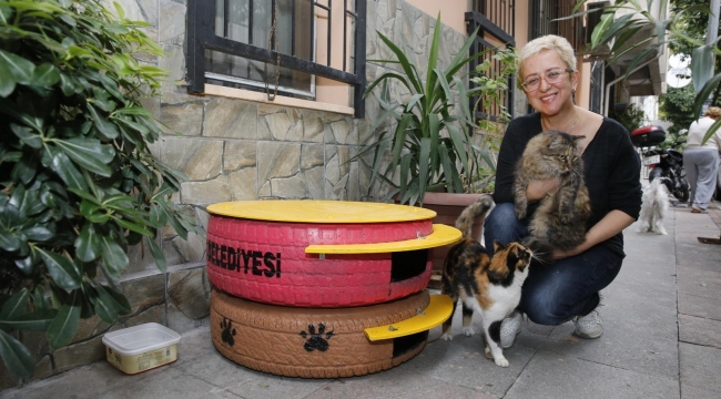Konak Belediyesi sokakta yaşayan kedilerin kış aylarında soğuktan korunması amacıyla araba lastiklerinden ev yaparak minik canlara ulaştırdı