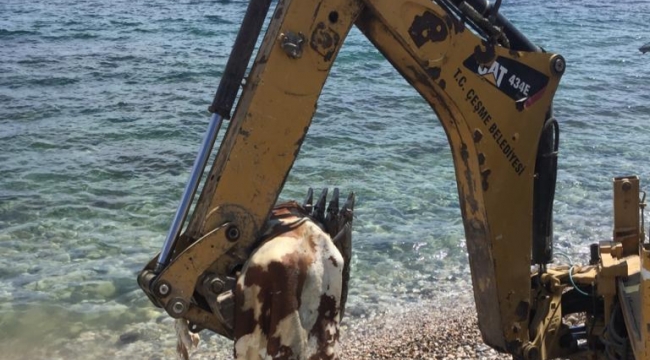 Gemilerle yurtdışından getirtilen ve bir limanda indirilme esnasında gemiden düşme ihtimali düşünülen ineğin Çeşme Belediyesi ekiplerince iş makinesi yardımıyla denizden çıkarılarak gömülüp imha edildi.
