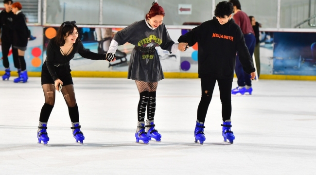 Okulların kapanmasını fırsat bilen gençler ve minikler soluğu İzmir Büyükşehir Belediyesi’nin olimpik buz sporları salonunda aldı. Karnesini getirenlerin ücretsiz kayabildiği pist, koskoca bir dönemin stresini buzda kayarak atanlarla dolup taştı.