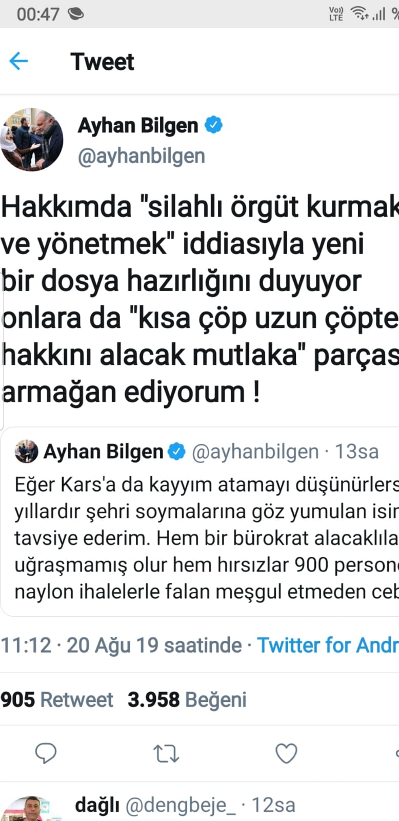 Ayhan Bilgen'in hakkında "silahlı örgüt kurmak ve yönetmek" iddiasıyla yeni bir dosya hazırlığını söyleniyor. Bilgen iddialara ilişkin şunları yazdı:"Eğer Kars'a da kayyım atamayı düşünürlerse yıllardır şehri soymalarına göz yumulan isimleri tavsiye ederim. Hem bir bürokrat alacaklılarla uğraşmamış olur hem hırsızlar 900 personeli naylon ihalelerle falan meşgul etmeden cebini doğrudan doldurur! Hakkımda "silahlı örgüt kurmak ve yönetmek" iddiasıyla yeni bir dosya hazırlığını duyuyor onlara da "kısa çöp uzun çöpten hakkını alacak mutlaka" parçasını armağan ediyorum!"